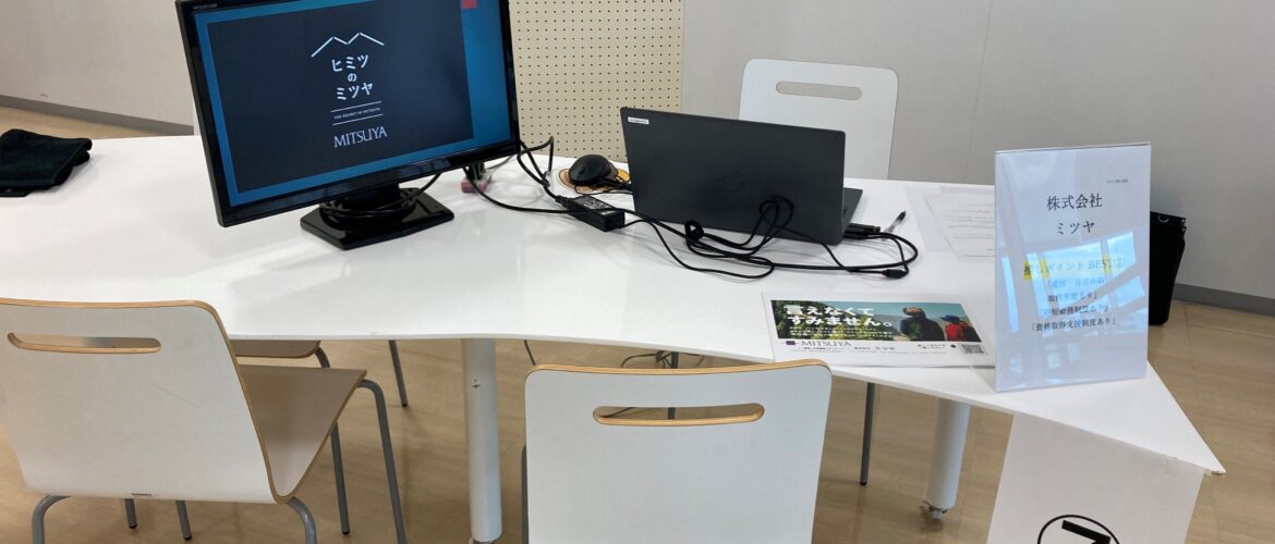 令和7年9月12日開催の合同企業説明会に参加しました!This entry was posted in お知らせ on 2025年9月12日 9月12日に大学連携センターFスクエア(アオッサ7F)において開催されました、 私服de合説に参加いたしました。 当日は、リモートと対面で合わせて4名の学生さんに参加していただきました。 弊社の事業内容に加えて、 福利厚生面の『推しポイント』について知っていただく機会になったかと思います。